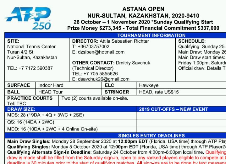 Október utolsó hetében új verseny került az ATP programjába: a kazah fővárosban, az egymillió lakosú Nur-Sultan (korábbi nevén Asztana) városában 273,345 ezer dollár összdíjazású férfi viadalt rendeznek, melynek tornaigazgatója - mint a mellékelt hivatalos dokumentum mutatja - Richter Attila Sebastien.
