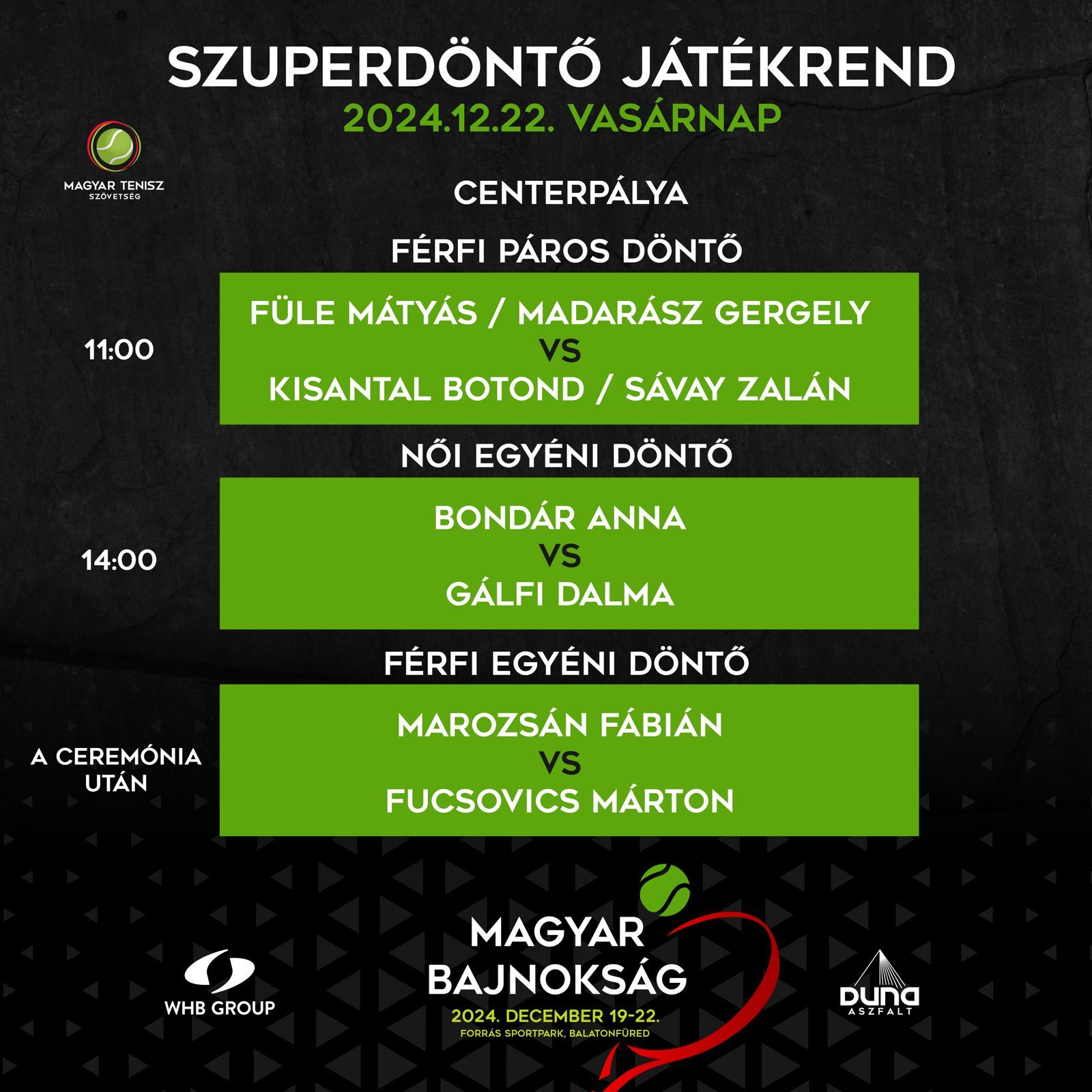 A következő találkozón, Fucsovics Márton lépett pályára az előző nap meglepetést okozó Boros Attila ellenében. Utóbbi 2:2-ig ugyan derekasan állta a sarat, ám ekkor Marci breakelt, s a folytatásban már nem adott több lehetőséget ellenfelének, villámgyorsan lezárta a meccset. S már készülhetett is a vasárnapi álomdöntőre, hiszen Piros Zsombor a kisidővel korábban sérülés miatt visszalépett az utolsó elődöntőtől. Marozsán Fábián így játék nélkül biztosította helyét a fináléban. (A nézők kedvéért elsőszámú teniszezőnk Fajta Péterrel játszott egy rövid bemutató meccset - a szerk.)