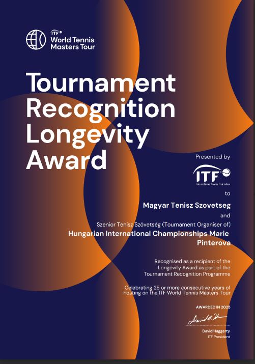 Az elmúlt napokban érkezett az ITF vezetőjétől a dicsérő okirat a Magyar Tenisz Szövetség és a Szenior Tenisz Szövetség címére, a hivatalos megfogalmazás szerint a kiemelkedő keszthelyi munkáért "as a Tournament Organiser of Hungarian International Championships Marie Pinterova. Celebrating 25 or more consecutive years of hosting on the ITF World Tennis Masters Tour".