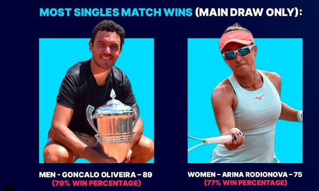 🏃♂️ Legtöbb egyéni győzelem: Goncalo Oliveira (89 - a meccseinek 79 százaléka)), illetve Arina Rodionova (75 - mérkőzéseinek 77 százaléka)