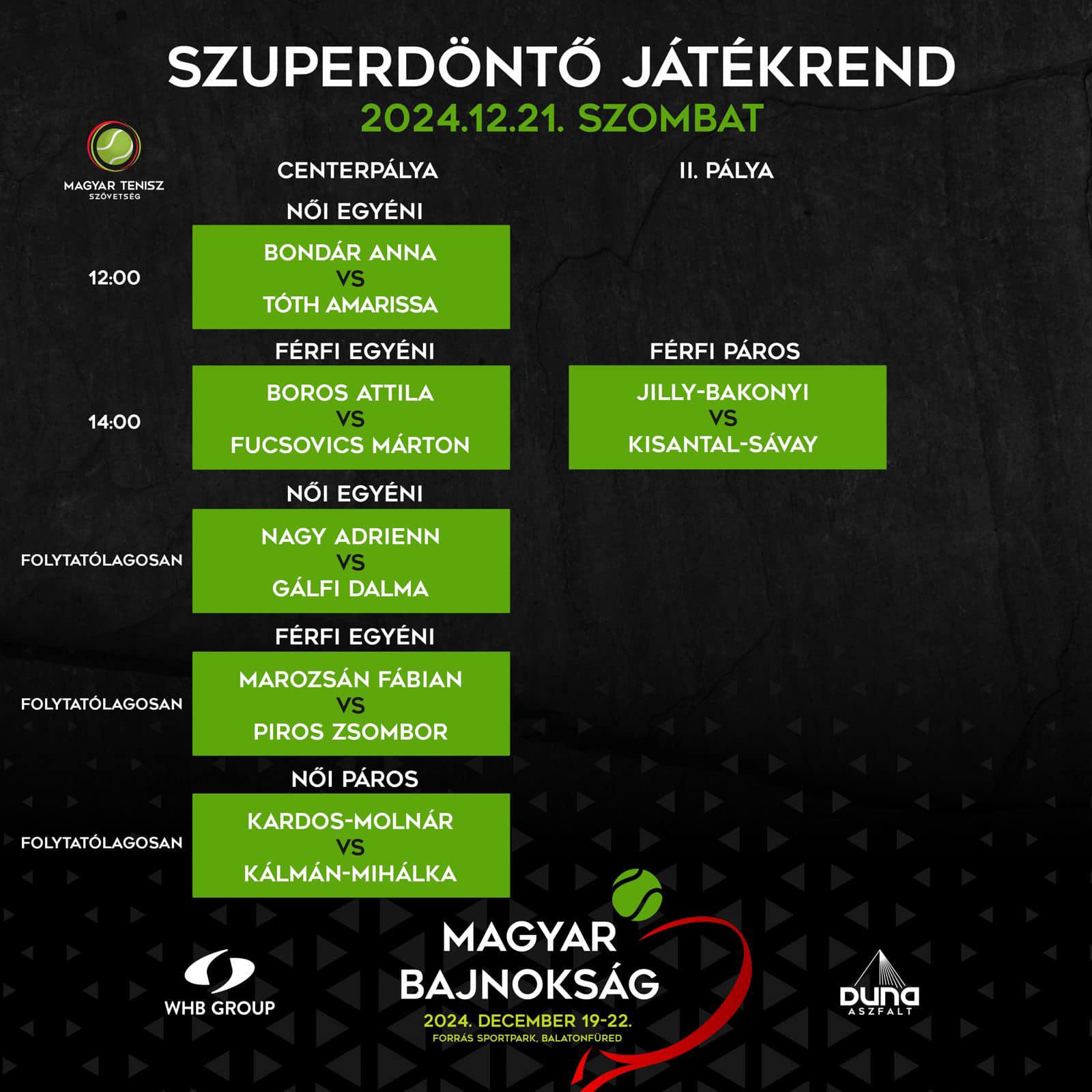 Pénteken kapcsolódott be a négy legjobb magyar női, illetve férfi játékos az idei ob szuperdöntőjének küzdelmeibe. A hölgyeknél egyetlen találkozón nem érvényesült a papírforma, az MTK-s Nagy Adrienn két szettben győzte le Babos Tímeát, aki több mint kétszáz hellyel megelőzi őt a női világranglistán. Előbbi pillanatnyilag a 600., utóbbi pedig 336. Mivel a kiemelésnél a WTA, illetve az APT világranglistás helyezést vette figyelembe az MTSZ, Udvardy Panna, Stollár Fanny és Szabanin Natália távollétében Nagy Adrienn az ötödik helyre sorolódott, így már csütörtökön pályára kellett lépnie. Ellenfele a fiatal Benke-Giosanu Izabella volt, aki ellen három játékot veszített csupán.